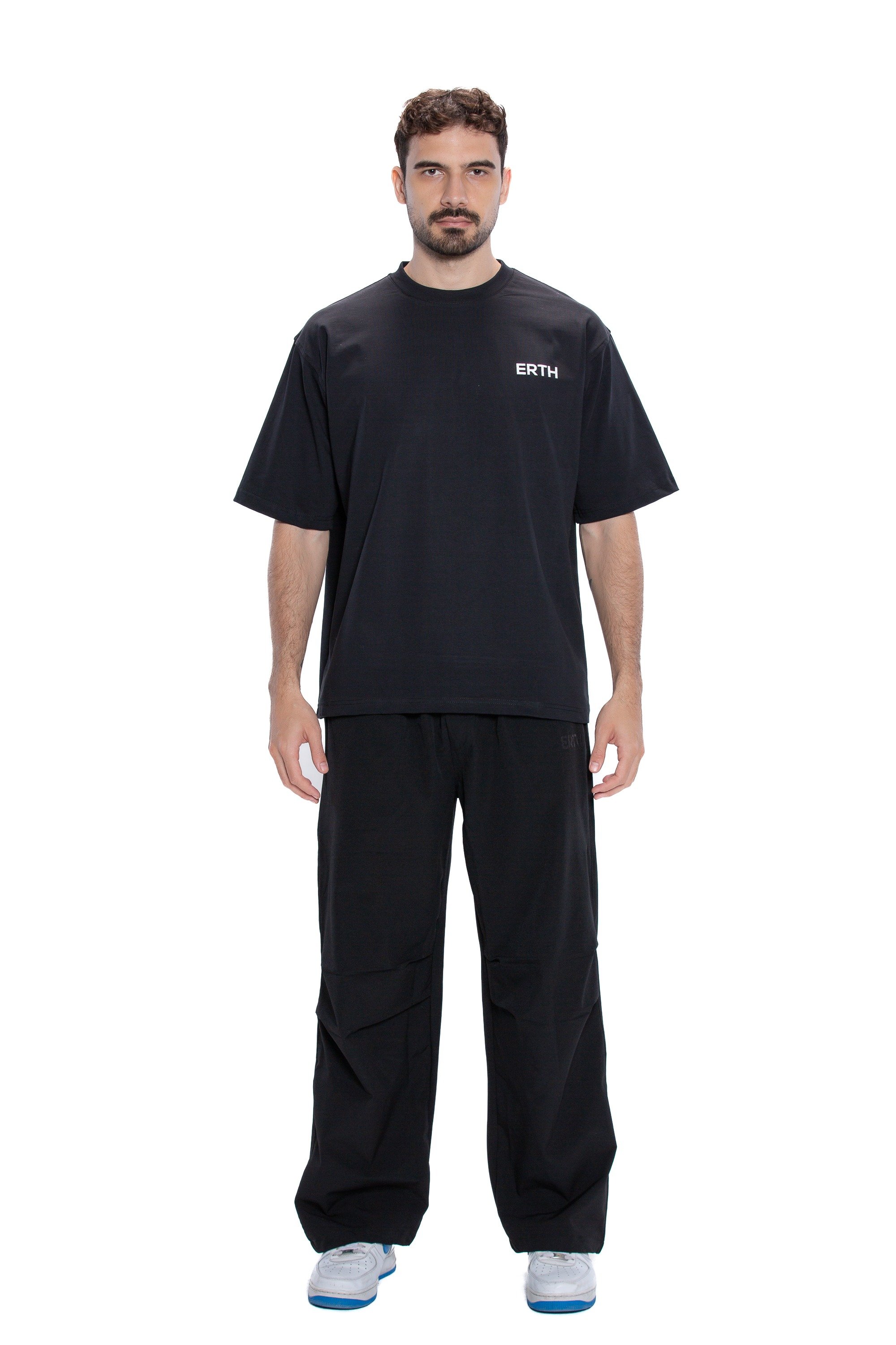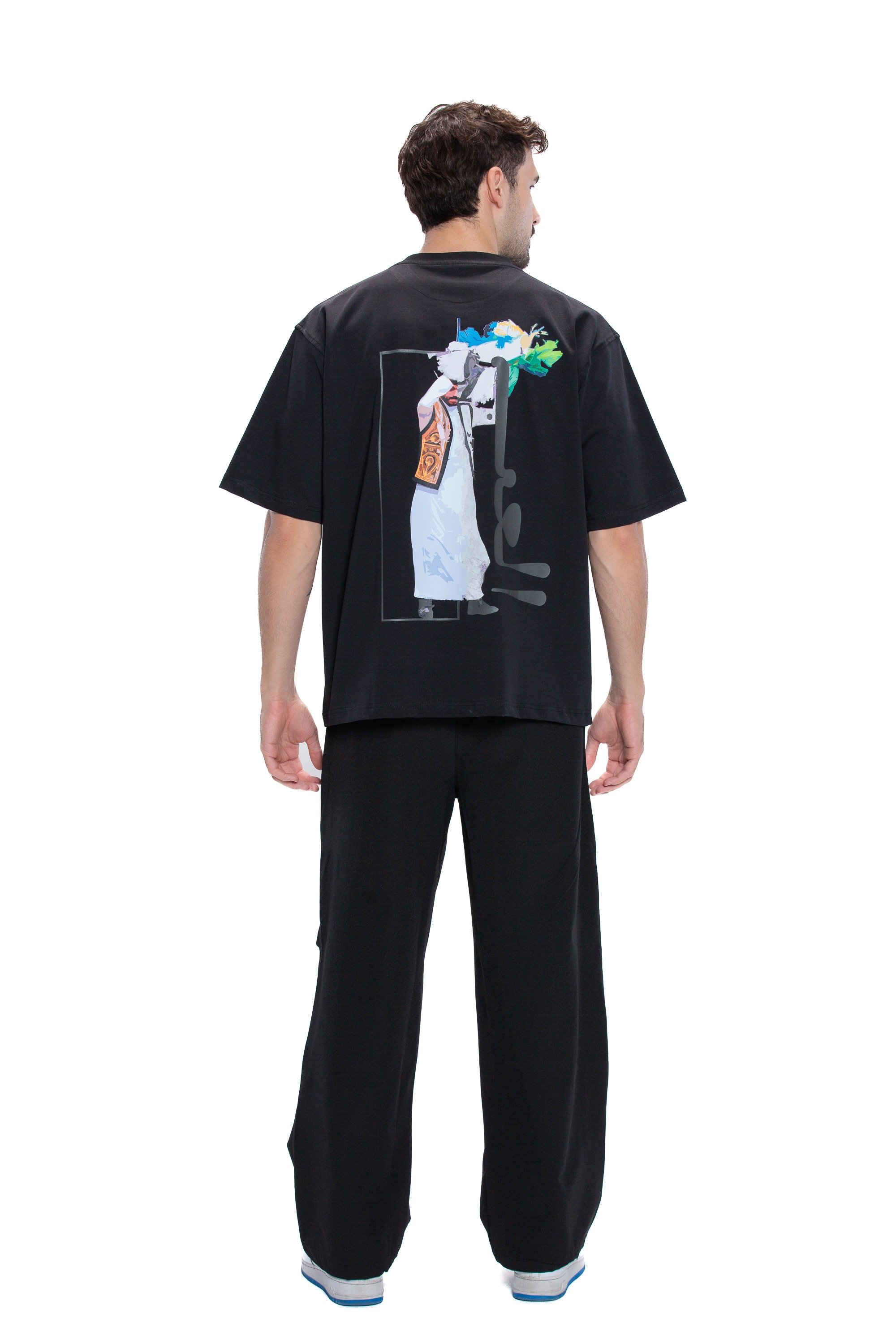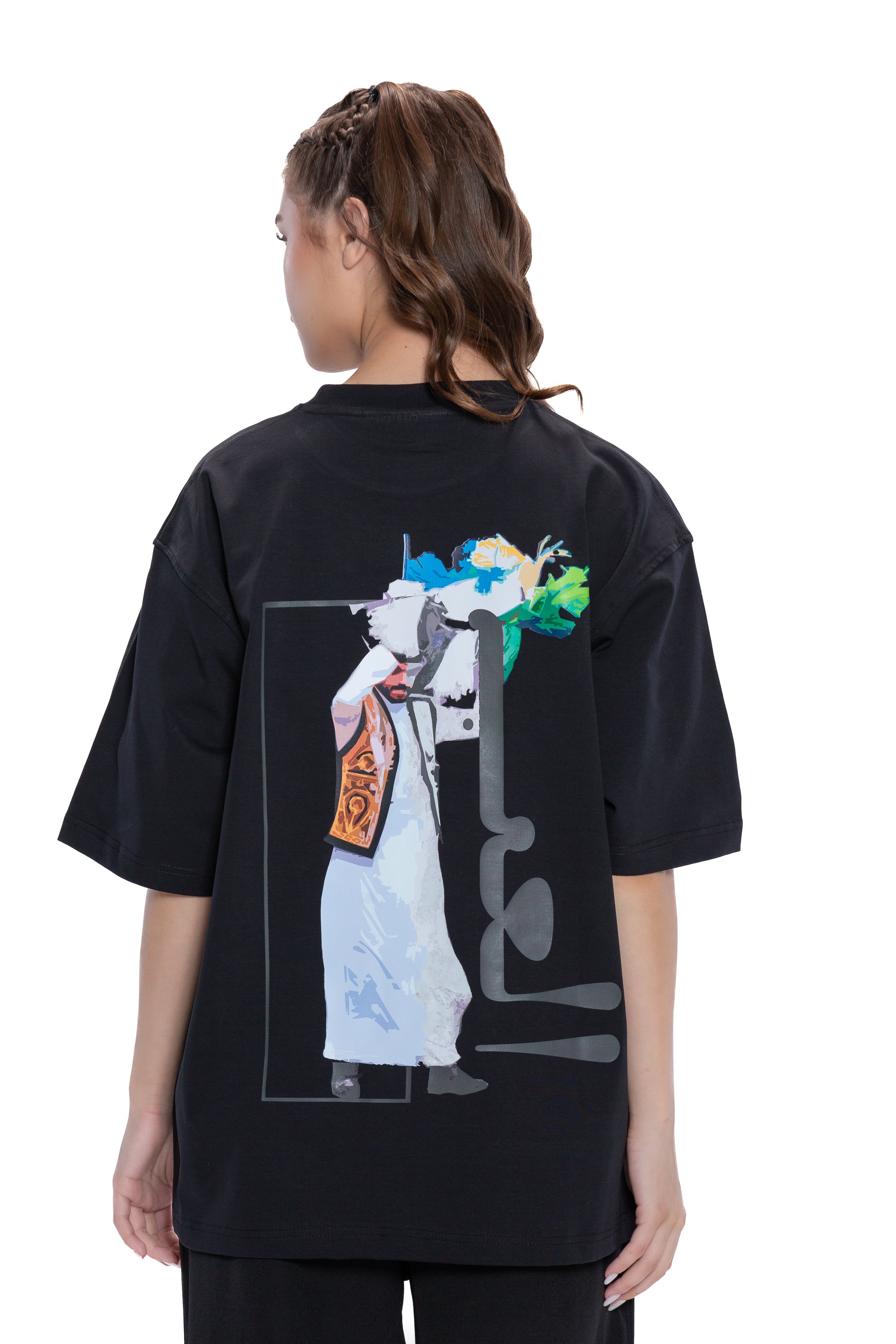 تيشيرت أسود أنيق بتصميم فني مستوحى من الفلكلور السعودي، يجمع بين عبق التراث وروح الموضة العصرية